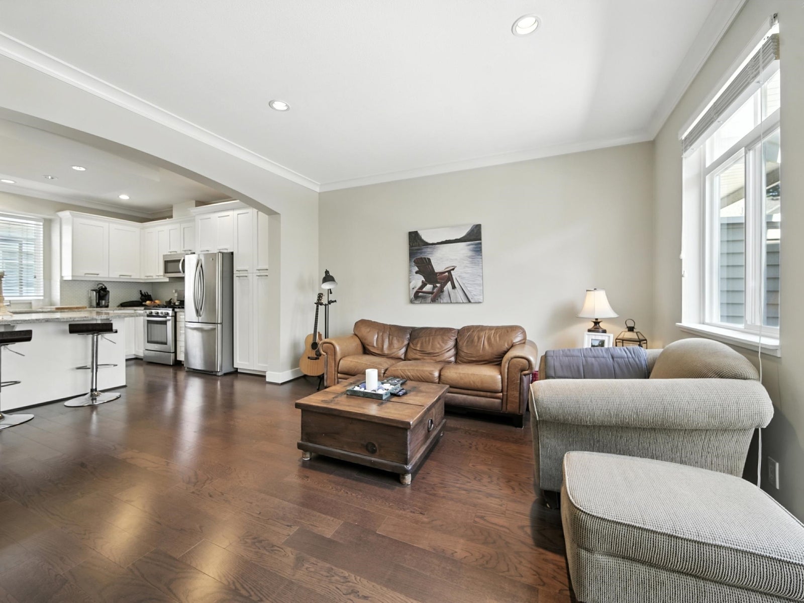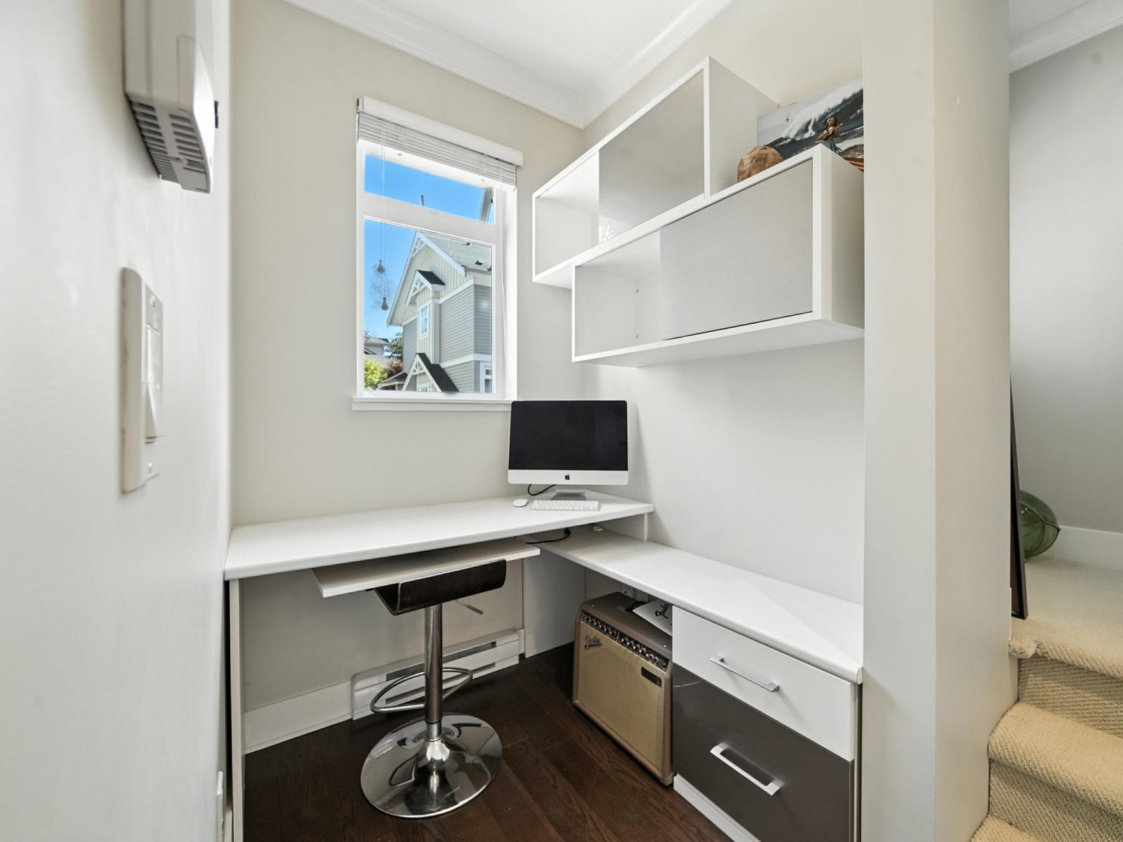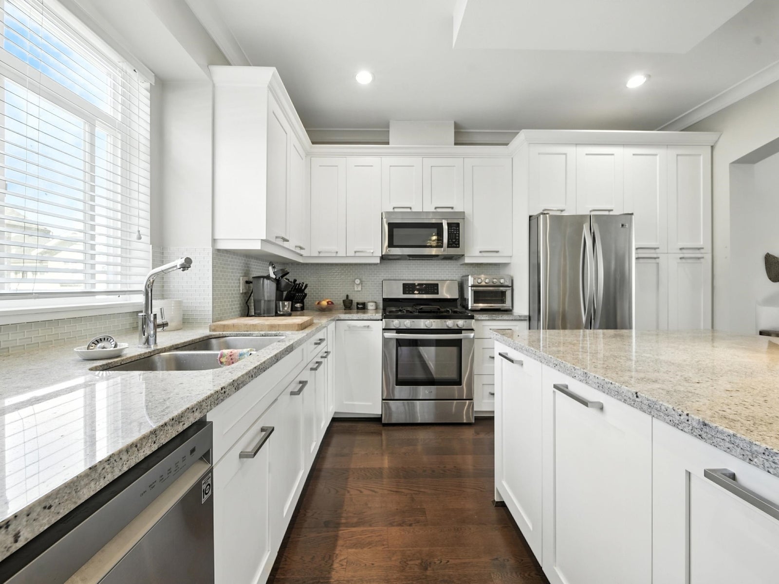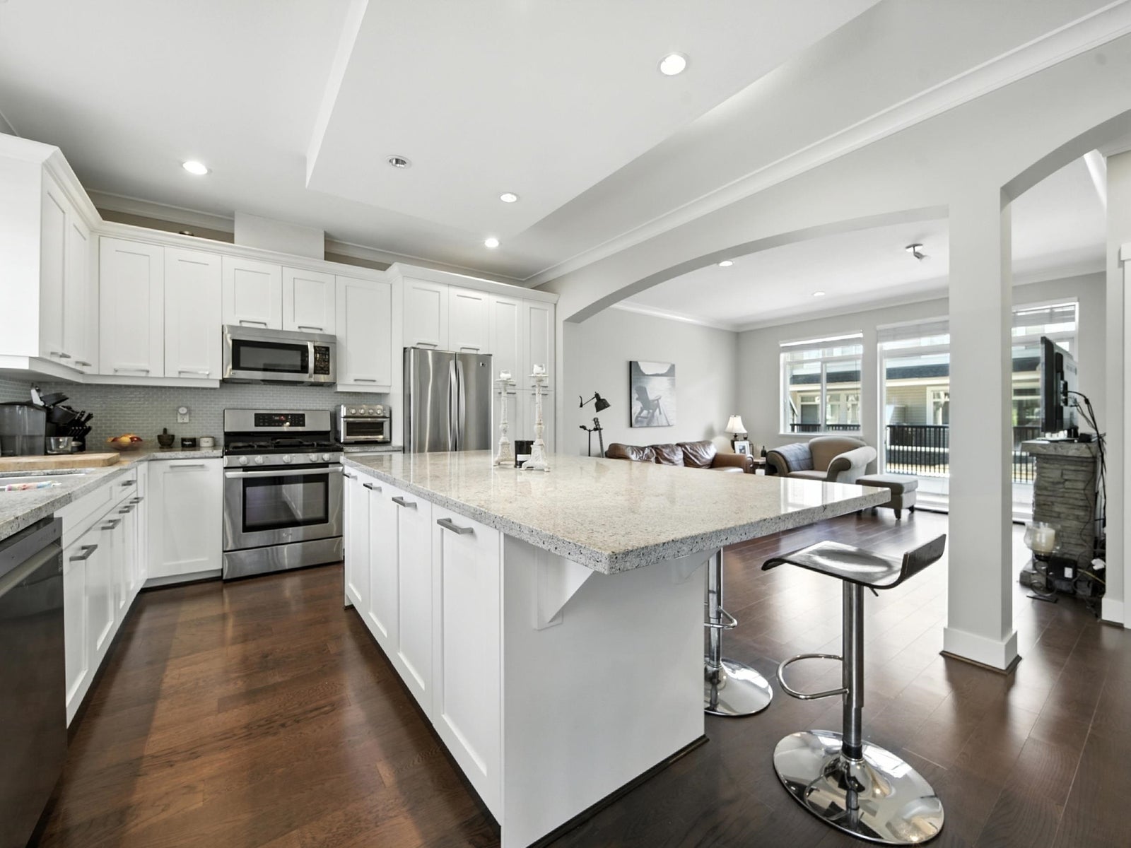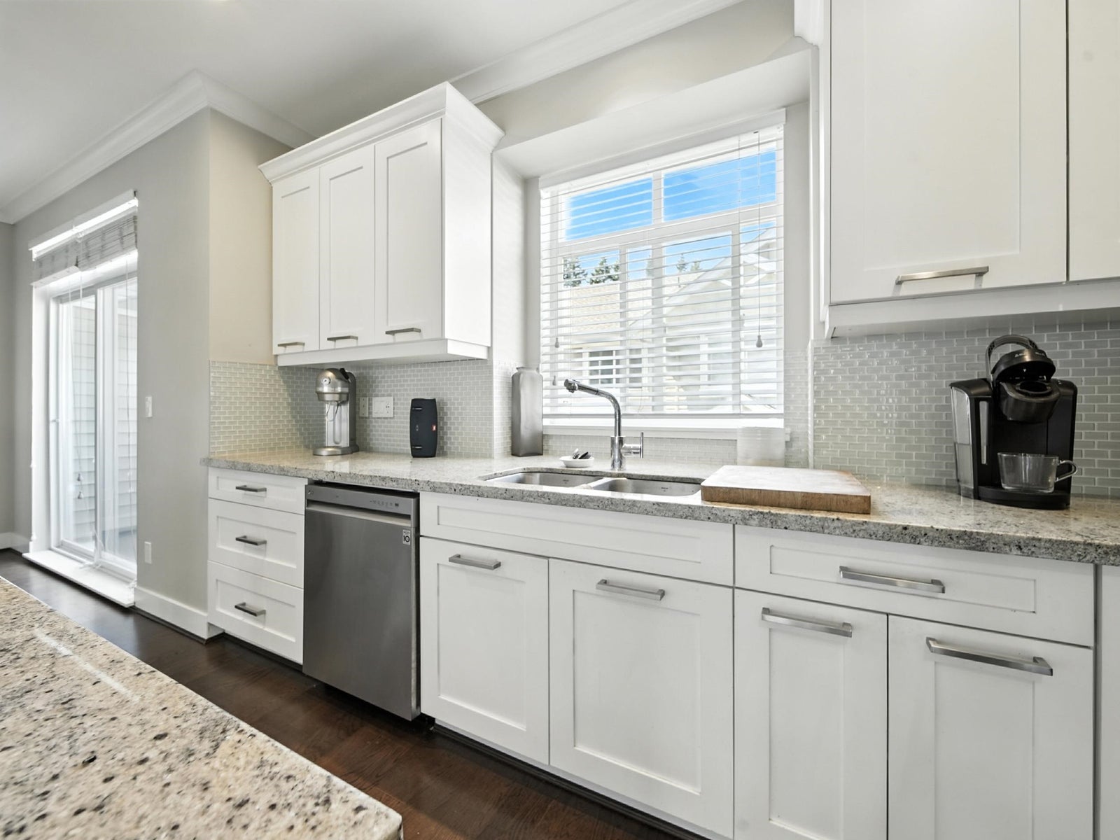 KEYSTONE – Beautiful and immaculately maintained duplex-style CORNER unit in a quiet, desirable location. This bright, open-concept home features 9’ ceilings and a chef’s kitchen with a massive granite island, granite countertops, and stainless steel appliances—an entertainer’s dream. Includes a custom built-in desk nook, perfect for a home office. Upstairs offers 3 generous sized bedrooms - the spacious primary bedroom boasts vaulted ceilings, a walk-in closet, and a spa-inspired ensuite with a frameless glass shower. The lower-level flex room offers versatility as a 4th bedroom, gym, or media/rec room. Double side-by-side garage, low strata fees, and ideally located near schools, supermarkets, shopping, and Hwy 99. School catchment: Semiahmoo Trail Elementary & Elgin Park Secondary.