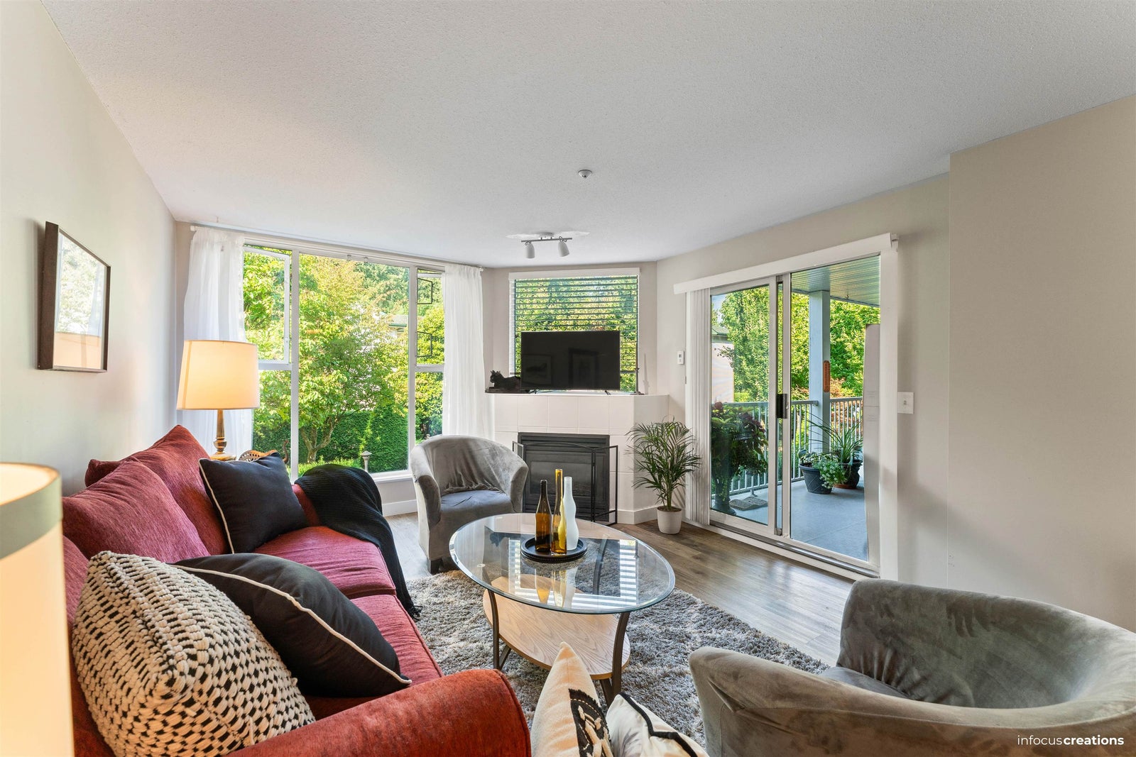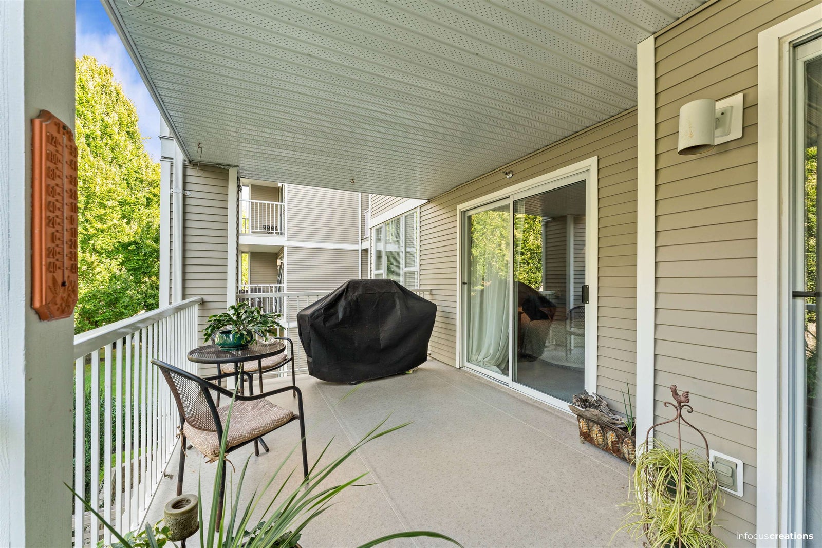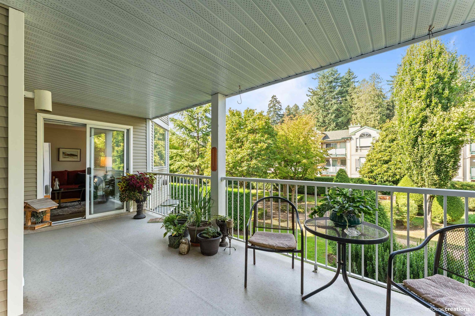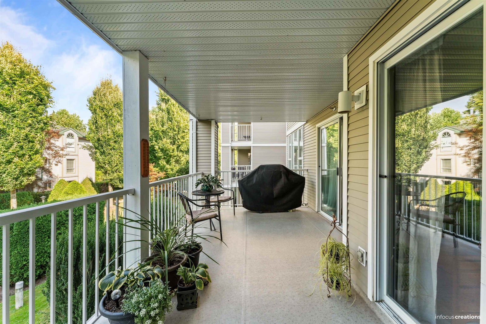 Lovely 1,140+ sq ft 2 Bed + Den condo with a huge fully covered patio and 3 separate entrances overlooking a peaceful courtyard. Bright white kitchen, laminate floors, spacious living room with corner gas fireplace, and large windows for tons of natural light. Both bedrooms have sliding doors to the patio. Oversized soaker tub, in-suite pantry/storage, extra locker, 2 parking stalls, and bike room. Just a 2-minute walk to West Coast Express and bus loop. OPEN HOUSE CANCELLED ******