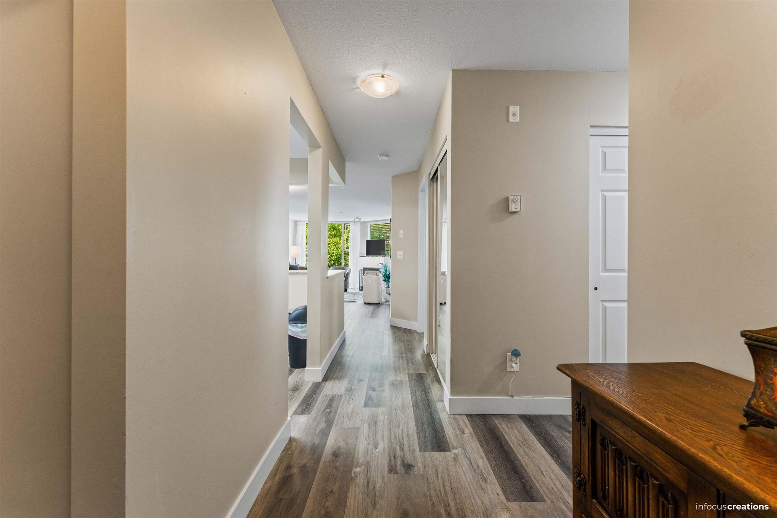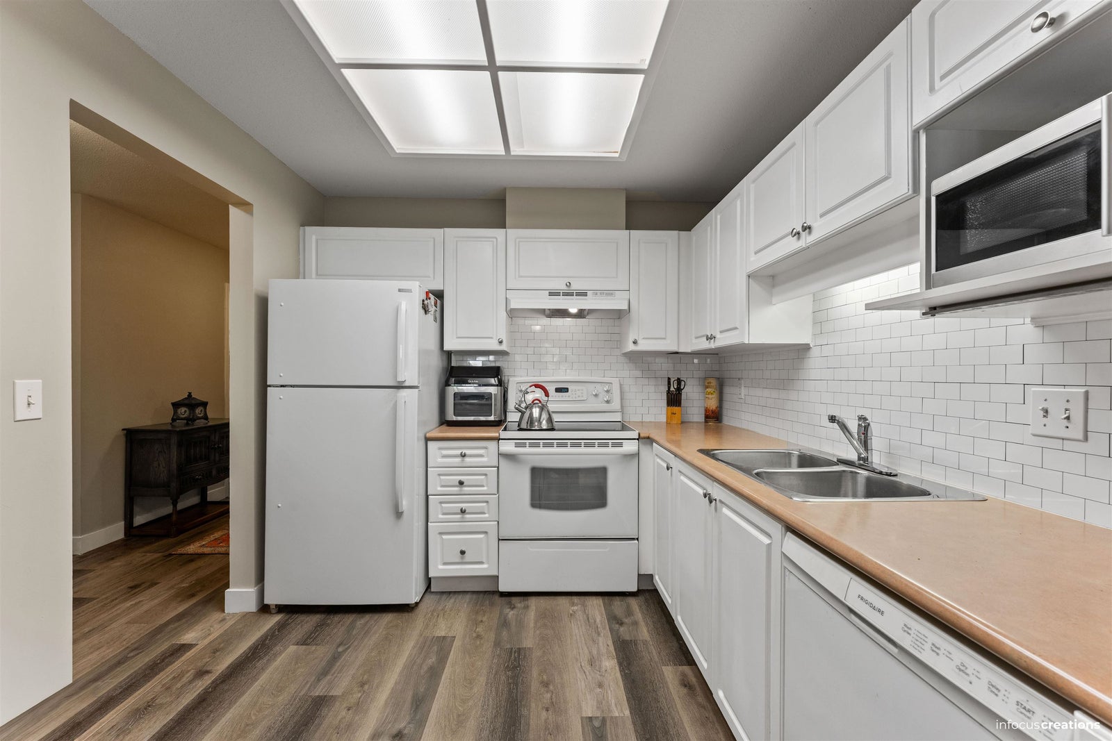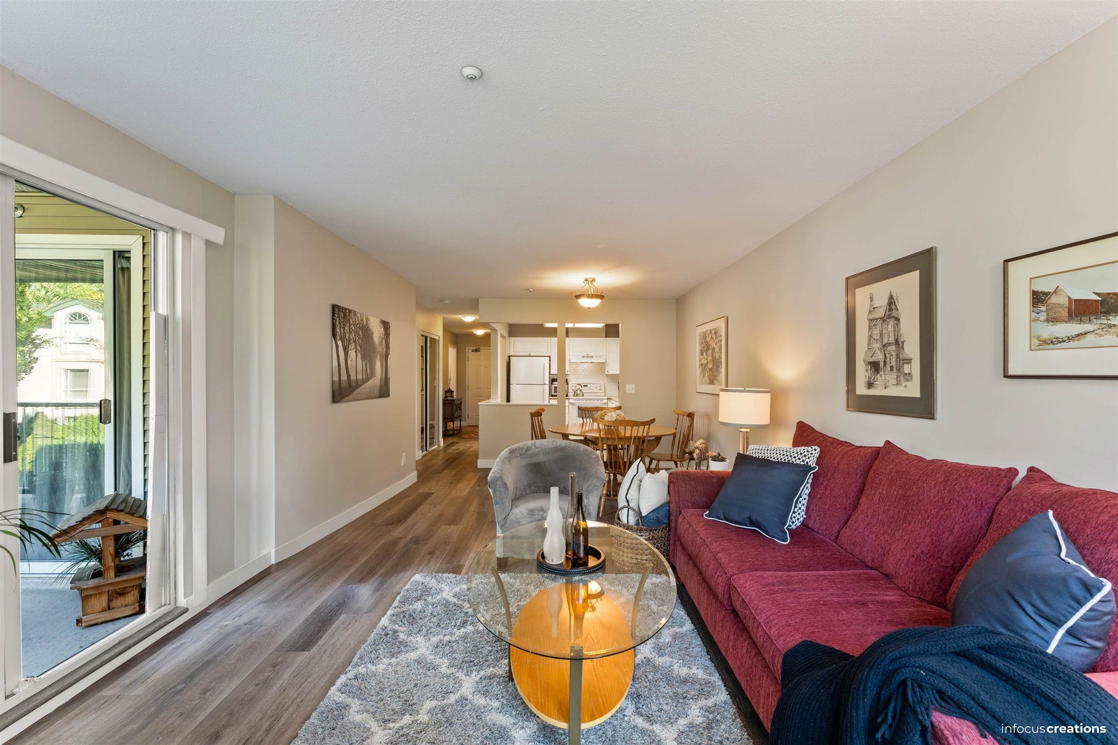Lovely 1,140+ sq ft 2 Bed + Den condo with a huge fully covered patio and 3 separate entrances overlooking a peaceful courtyard. Bright white kitchen, laminate floors, spacious living room with corner gas fireplace, and large windows for tons of natural light. Both bedrooms have sliding doors to the patio. Oversized soaker tub, in-suite pantry/storage, extra locker, 2 parking stalls, and bike room. Just a 2-minute walk to West Coast Express and bus loop. OPEN HOUSE CANCELLED ******
