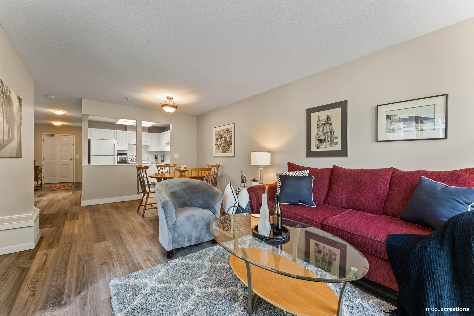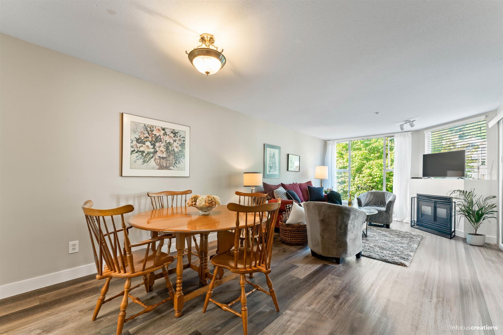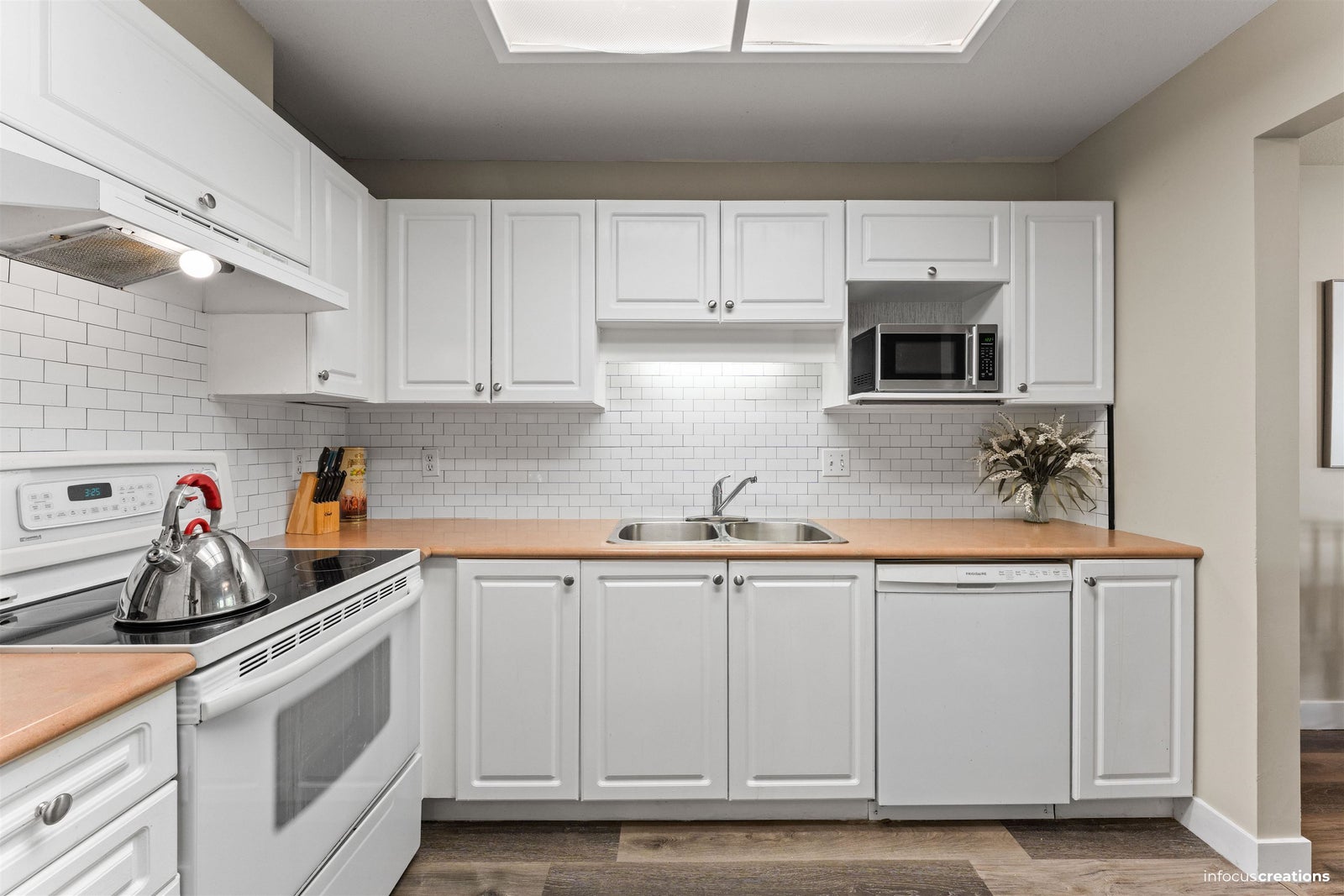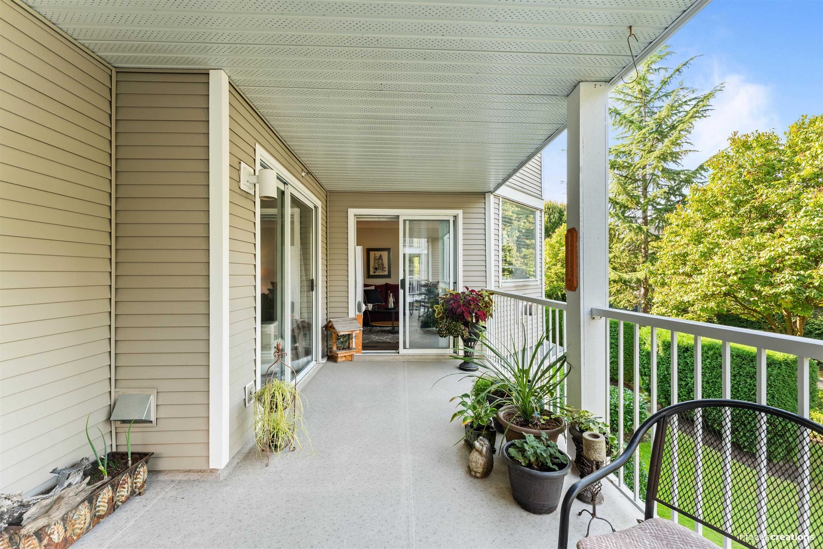 Lovely 1,140+ sq ft 2 Bed + Den condo with a huge fully covered patio and 3 separate entrances overlooking a peaceful courtyard. Bright white kitchen, laminate floors, spacious living room with corner gas fireplace, and large windows for tons of natural light. Both bedrooms have sliding doors to the patio. Oversized soaker tub, in-suite pantry/storage, extra locker, 2 parking stalls, and bike room. Just a 2-minute walk to West Coast Express and bus loop. OPEN HOUSE CANCELLED ******